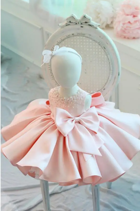New Fashion Beaded Bow Baby Girl Dress Princess Fluffy Tulle Infant Clothes Baby Girls Baptism Chri